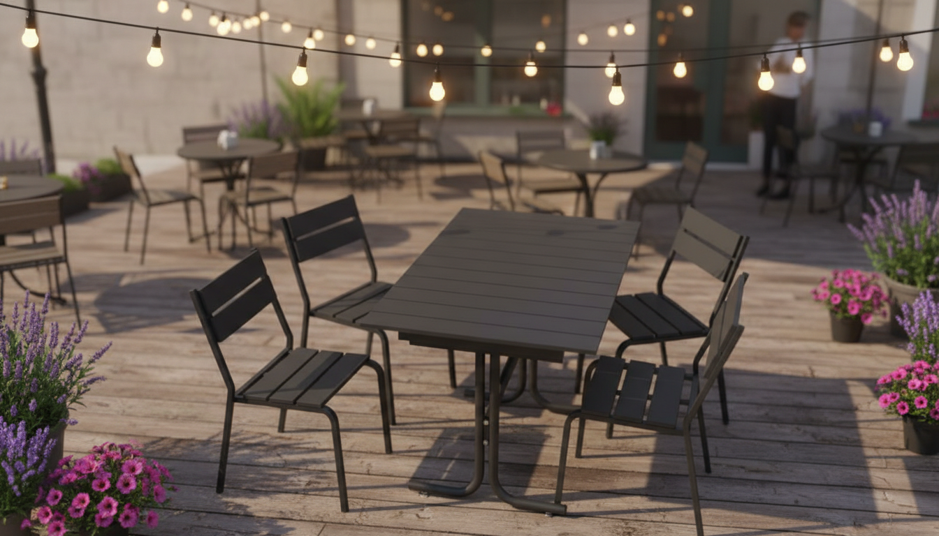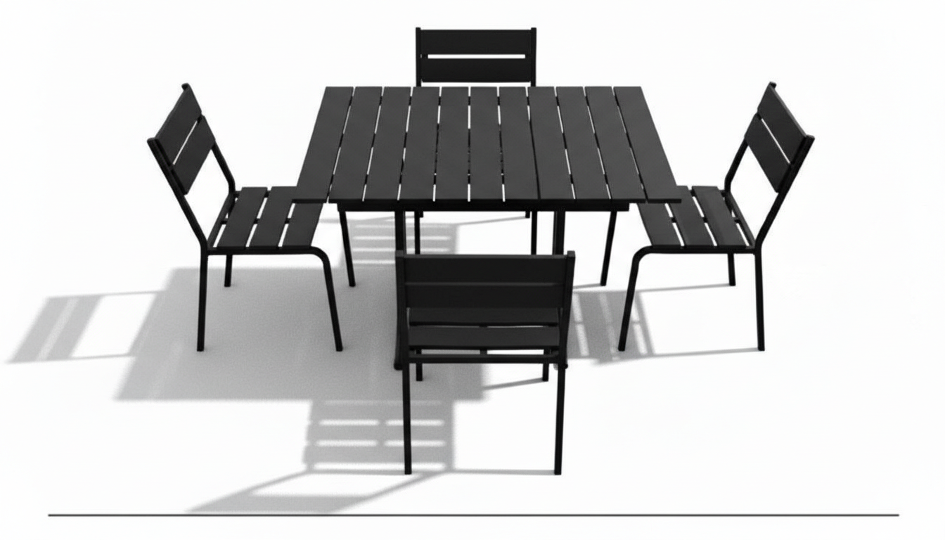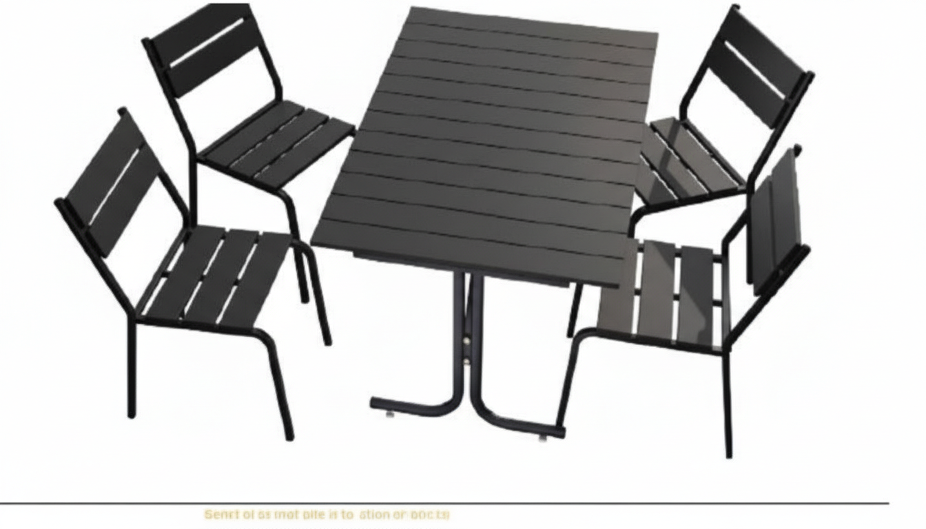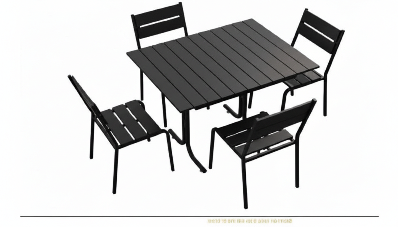 Современный комплект уличной мебели — прямоугольный стол и 4 стула в чёрном исполнении. Прочный металлический каркас и стойкая к погоде полимерная экодоска на столешнице и сидениях — идеальное сочетание минимализма, комфорта и долговечности. Этот комплект уличной мебели сочетает надежный металлический каркас и экологичную полимерную экодоску, имитирующую дерево по внешнему виду, но превосходящую его по стойкости к влаге, УФ и истиранию. Стол с горизонтальными ламелями и слотовая(реечная) конструкция обеспечивают удобство и хорошую вентиляцию сидений, а лаконичный чёрный цвет легко вписывается в интерьер террасы, веранды или летнего кафе. Низкие требования к уходу — простая мойка мягким мыльным раствором — и долговечность материалов делают этот набор выгодным выбором на весь сезон и дольше.
